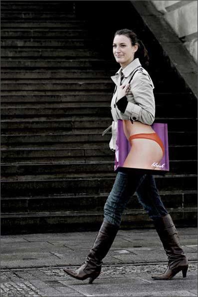 • Exemplo 1: Sacolas com imagens de roupas ou acessórios, como biquínis, que brincam com a perspectiva do corpo.
